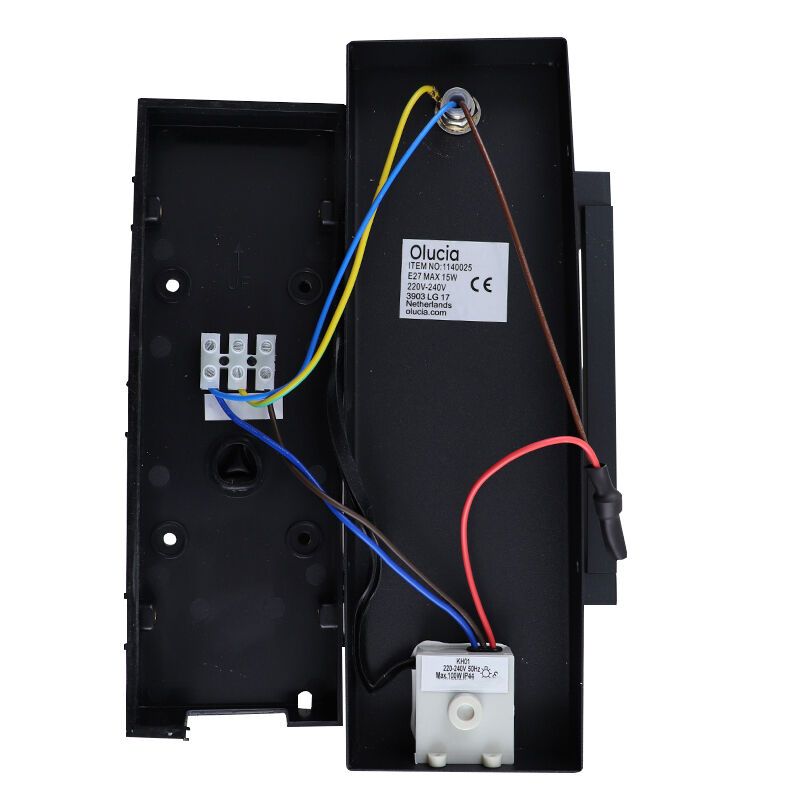 Información de producto Potencia máxima 15 Voltaje de suministro 220-240V Número de luces 1 Tipo de casquillo E27 Información de producto Incluyendo luz No Anchura en cm 13 Altura en cm 26.4 Longitud en cm 19 Regulable Si (no incluido) Garantía 2 años Grado de protección IP IP54 (resistente al agua y al polvo) Color Negro Material Aluminio, Vidrio Con interruptor Si Estilo Moderno Tipo de interruptor Sensor crepuscular Número de articulo Q51734 - Inicio