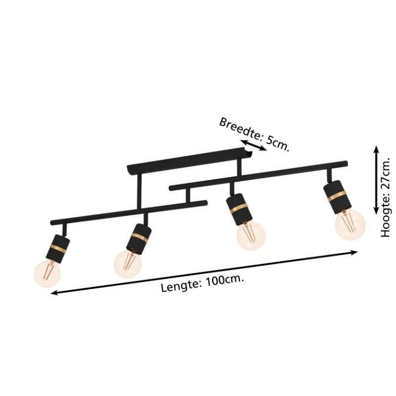 Información de producto Potencia máxima 10 Voltaje de suministro 220-240V Número de luces 4 Tipo de casquillo E27 Información de producto Incluyendo luz No Anchura en cm 5 Peso en kg 1.413 Altura en cm 27 Longitud en cm 100 Regulable Si (no incluido) Garantía 2 años Grado de protección IP IP20 (a prueba de polvo) Color Oro, Negro Material Aluminio Estilo Básico Número de articulo Q33816 - Inicio