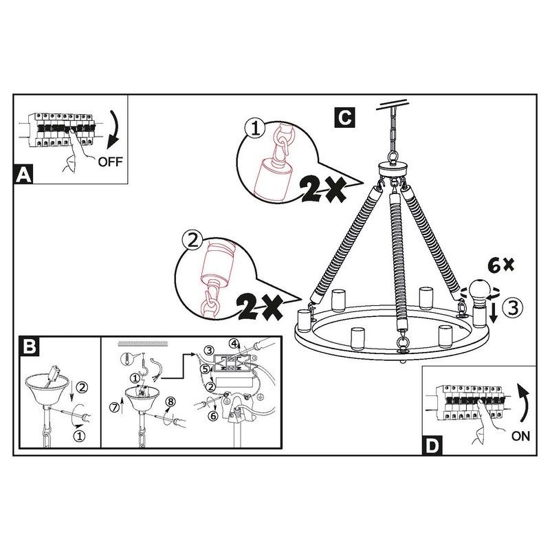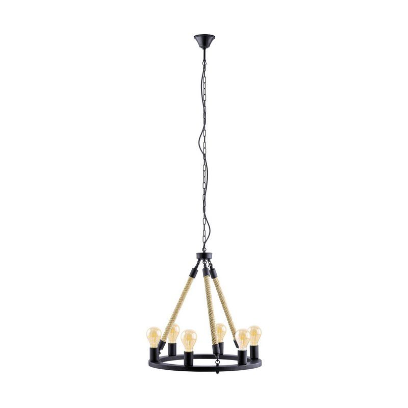 Información de producto Potencia máxima 60 Voltaje de suministro 220-240V Número de luces 6 Tipo de casquillo E27 Información de producto Incluyendo luz No Anchura en cm 56 Diámetro en cm 56 Peso en kg 5.5 Altura en cm 150 Regulable Si (no incluido) Garantía 2 años Grado de protección IP IP20 (a prueba de polvo) Color Marrón, Negro Material Metal, Cuerda Estilo Retro Número de articulo Q16477 - Inicio