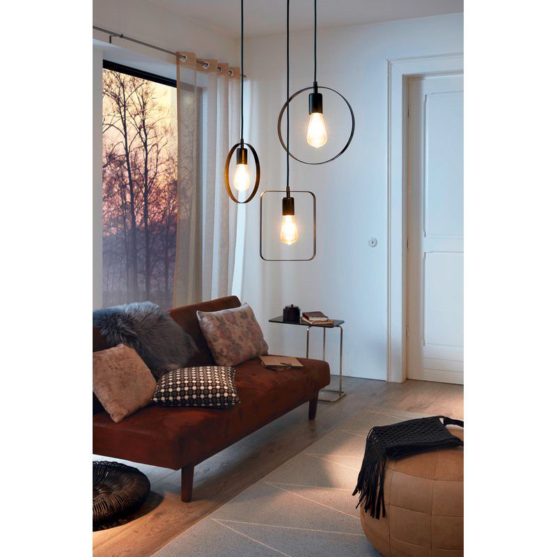 La lámpara colgante retro negra Aida está hecha de metal. La lámpara colgante negra se suministra sin fuente de luz adecuada con casquillo E27. El dispositivo puede alojar fuentes de luz LED con una potencia máxima de 60W.