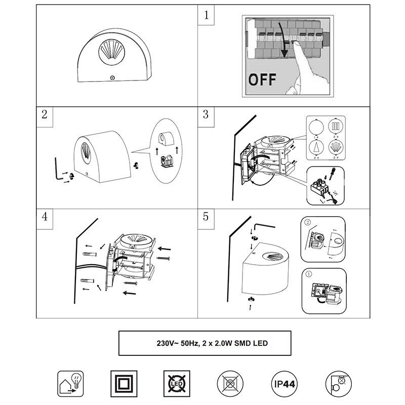 Información de producto Potencia máxima 2 Voltaje de suministro 220-240V Número de luces 2 Número de lúmenes 200 Información de producto Color de luz 3000K (blanco cálido) Tipo de casquillo LED integrado Tipo de bombilla incluida LED integrado Número esperado de horas de vida útil 30000 Incluyendo luz Si, integrado Anchura en cm 15 Peso en kg 0.485 Altura en cm 9 Longitud en cm 15 Regulable No Garantía 2 años Grado de protección IP IP44 (resistente al agua y al polvo) Color Negro Material Plástico Con interruptor No Con cable y enchufe No Estilo Diseño Número de articulo Q14511 - Inicio